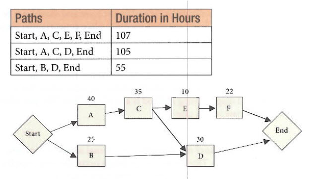 Did you notice how difficult this question was to read? Such wording is intentional to prepare you for interpreting on the real exam. Looking at this situation, you see there are three paths through the network as shown in the following table. If the duration of activity B changes from 25 to 37, the activity will take 12 hours longer. As the activity is only on the third path, it will only change the duration of that path from 55 + 12, or 57 hours. Since the duration of the critical path is 107 hours, the delay with activity B will have no impact on the project timeline or the current critical path.