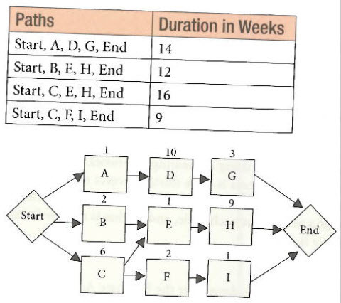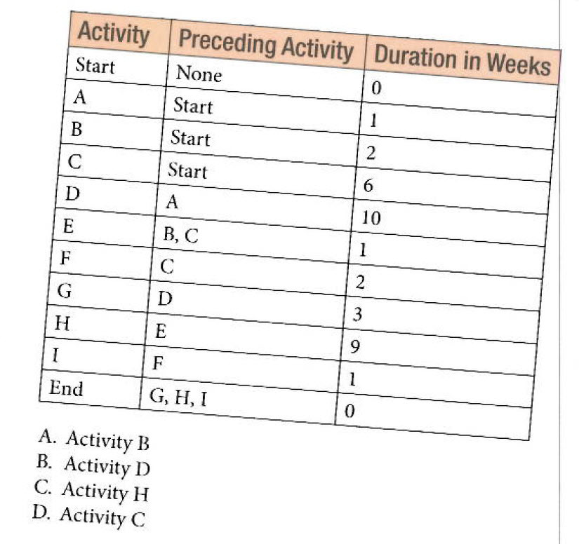 The critical path is 16 (Start, C, E, H, End). Many people immediately look for the longest duration activity on the project to cut. Here activity D is the longest, at 10 weeks. However, that activity is not on the critical path, and cutting it would not shorten the project’s duration. You must change the critical path. In this case, both activity C and activity H are on the critical path. If you have a choice, all things being equal, choose the earlier option. Therefore, activity C is the best answer.