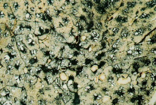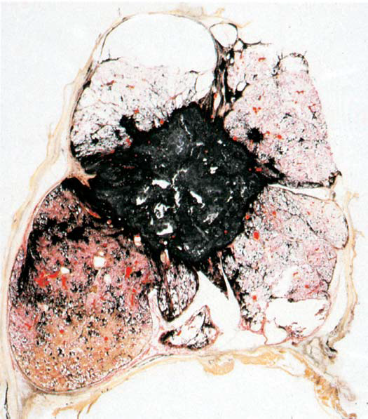 Nonpalpable coal-dust macules and palpable coal-dust nodules thoughout the lung.