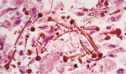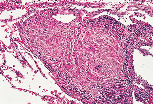 A lung biopsy of a patient is shown below. What is your Dx? What are the characteristic morphologies seen below?