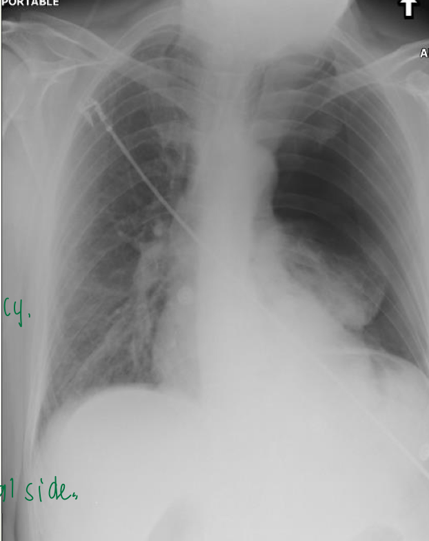 this is a major pneumothorax ont he left hand side. there is a completely black lung and hilum cannot be seen on left side. there is also a tracheal shift to the contralateral side. this is a tension pneumo
