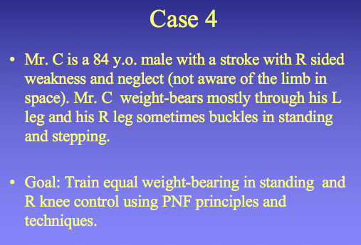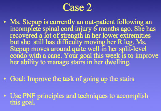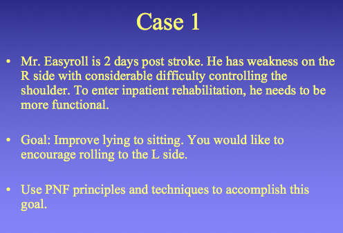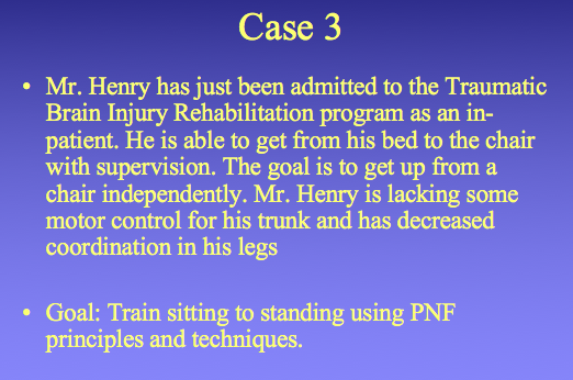 -Mme G lacks some motor control for her trunk and tends to sit with her trunk side-flexed or slumped on the right side. Her right hip is also slightly flexed than the left side. Goal: train better sitting posture using PNF principles and techniques.