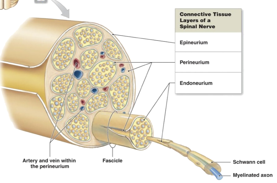Give the gross anatomy of a spinalnerve incl the 3 connective tissue layers