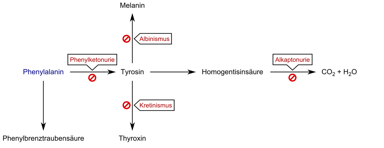 Die bis jetzt bekannten Stoffwechselstörungen einer Phenylketonurie bennenen.