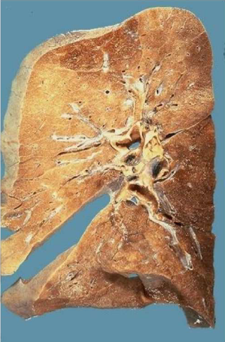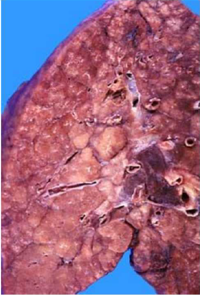 Descrizione: Polmone con strutture bronchiali dilatate e focolai di broncopolmonite.