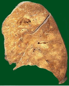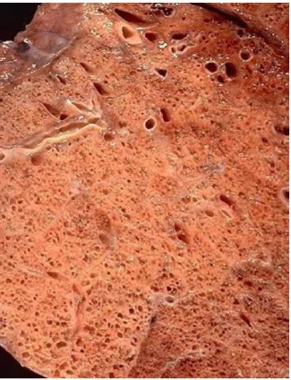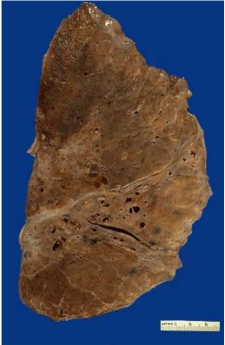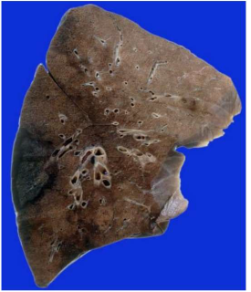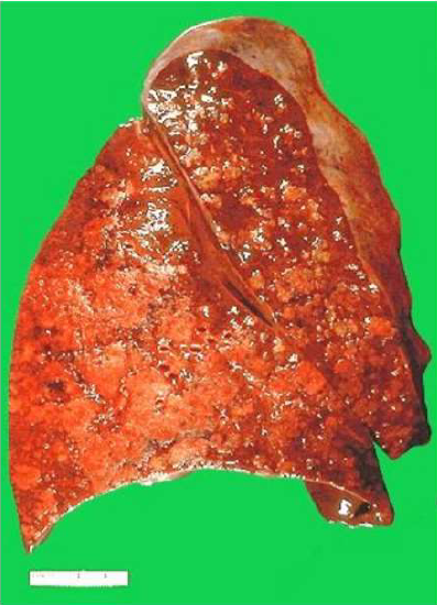 l’ilo. Il tipico aspetto spugnoso polmonare è sostituito dalla presenza di noduli fibrosi di colore grigiastro,