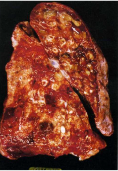Descrizione: Polmone con focolai multipli di broncopolmonite e cavità ascessualizzata.