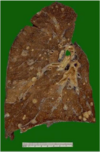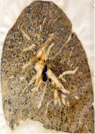 Descrizione: Polmone con depositi diffusi di pigmento nero. DD noduli con addensamenti, ben