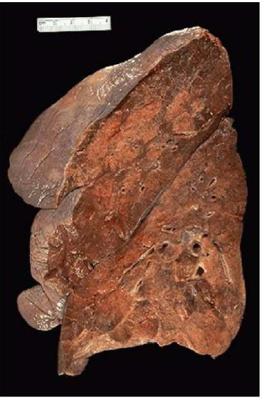 Macroscopicamente: Il parenchima polmonare interessato rimane di consistenza aumentata ed il