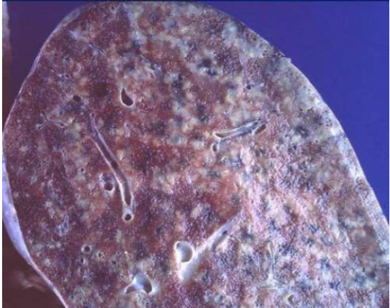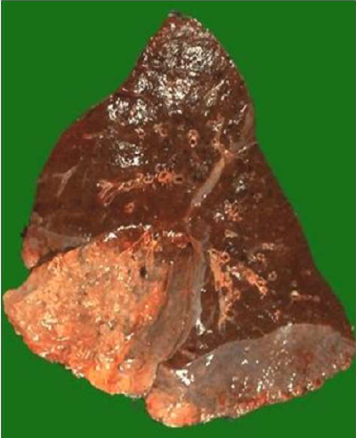 Epatizzazione rossa: il lobo appare compatto, rossastro (epatizzazione)