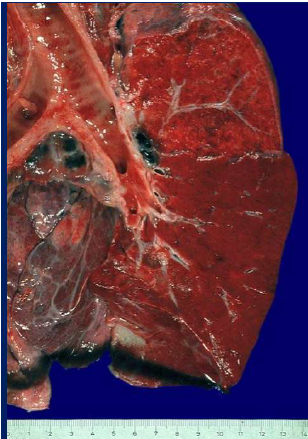lobo di colore rosso vivo e di aspetto congesto.