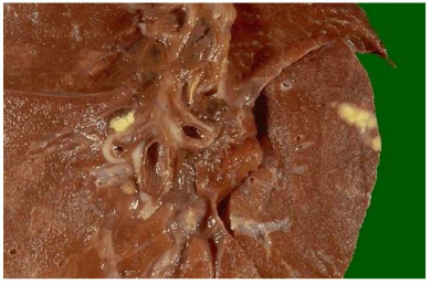 Epatizzazione grigia: il lobo appare compatto, bianco-grigiastro