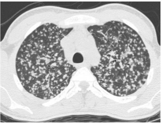 problemi di fissazione, piccoli noduli antracotici (normale in un polmone di una persona che vive in