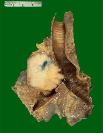 bronco. Si tratta di un carcinoma squamocellulare in quanto parte dal bronco, c’è una resezione di