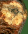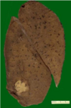 Descrizione: Porzione di parenchima polmonare con lesione nodulare fibrosa in continuità con il