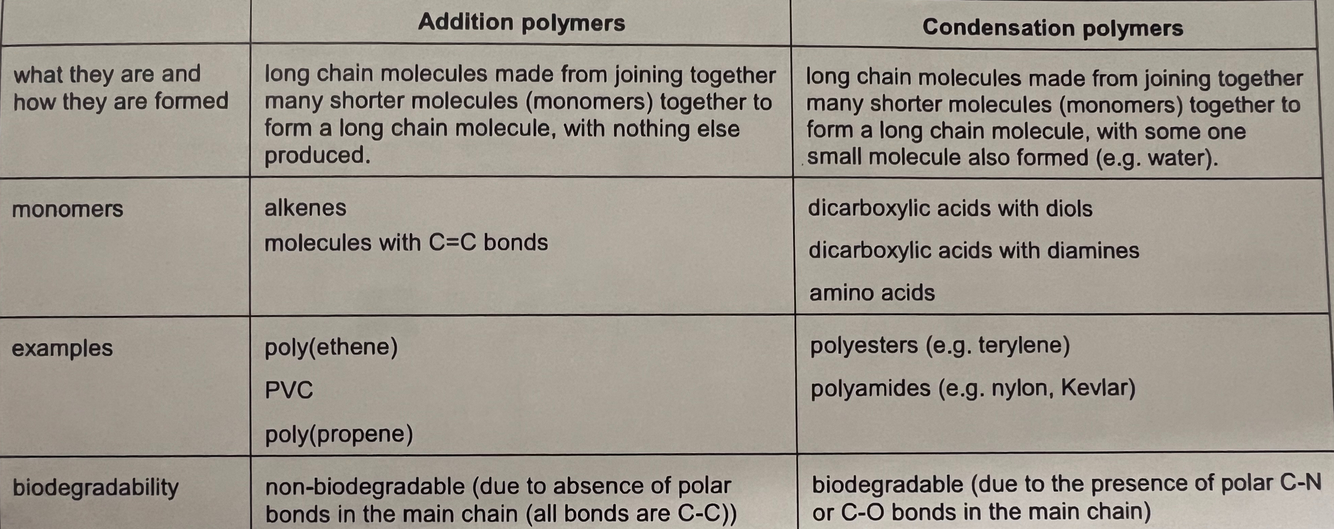 Compare addition vs condensation polymerisation (include examples, monomer, interactions and biodegradability)