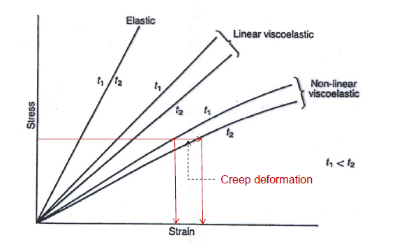 Stress-strain curve of elastic and viscoelastic materials at two values of time