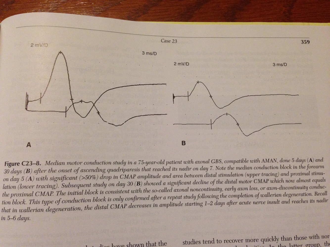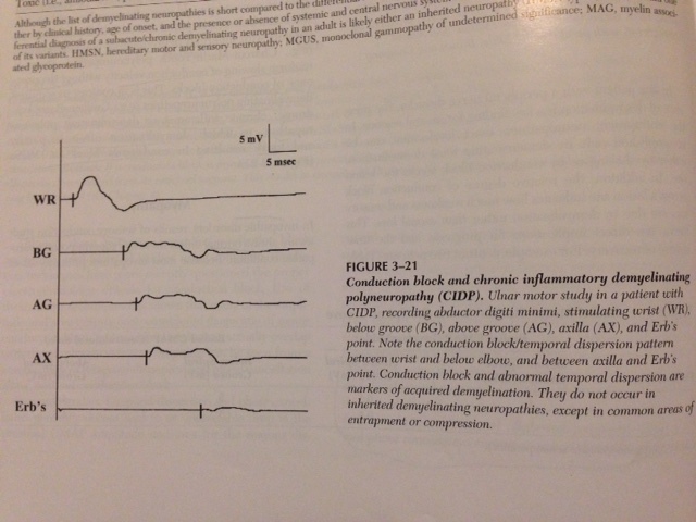 decreased CV with prolonged latencies, assymetric CB/temporal dispersion. EMG- decreased recruitment with large MUAPs, +paraspinals, will improve with plasma xchange or corticosteroids
