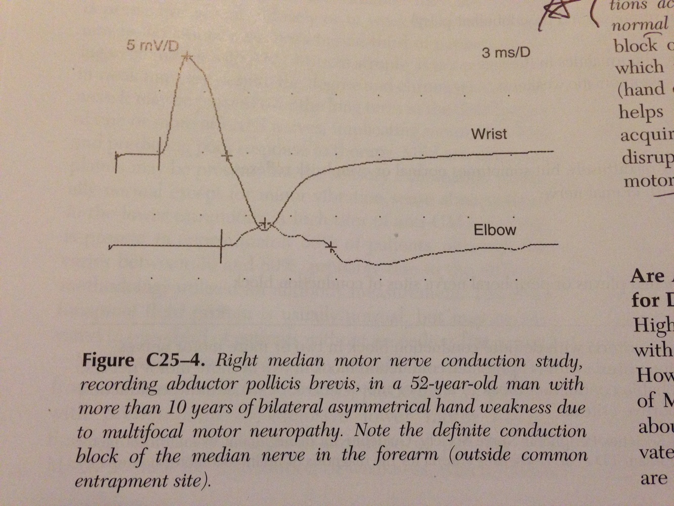 Patchy demyelination with conduction block and increased temporal dispersion; occur in noncommon entrapment sites. ie: forearm