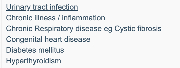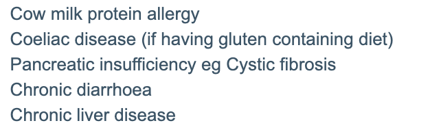 - if on solids or feeds containing gluten - coeliac serology and tital IgA