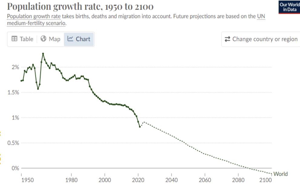 What has been the trend in the annual world population growth rate since the 1960s?