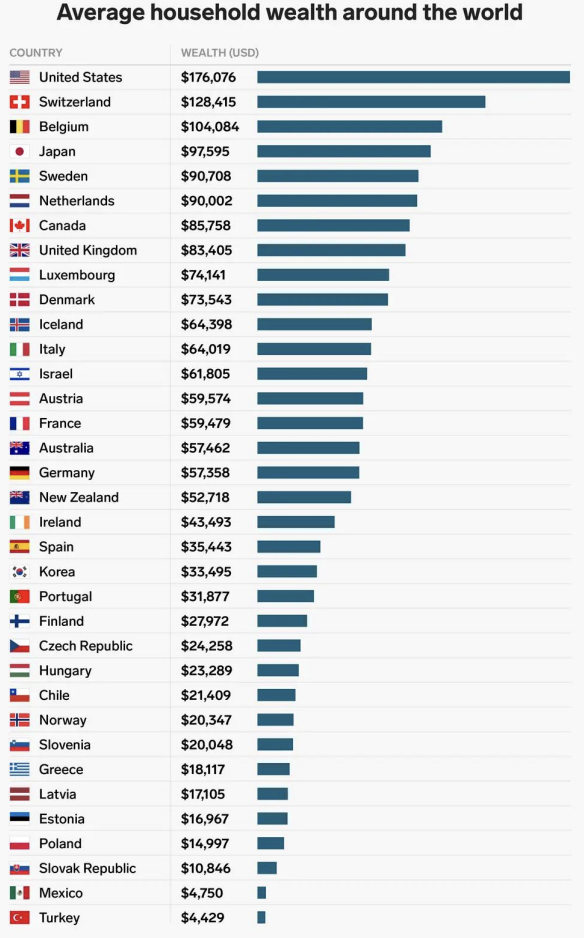 Name the 3 countries with the highest household wealth