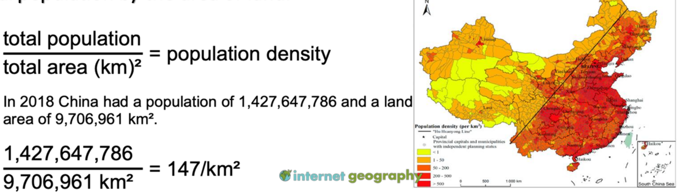 Describes the average number of people living in a given area, calculated by dividing the total population by the area of land (usually km²).