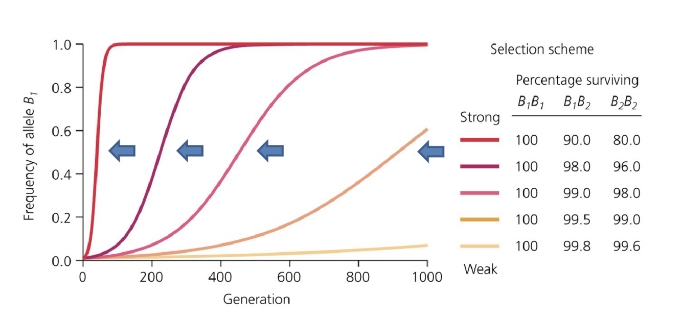 - Weaker selection takes longer BUT B1 will still increase