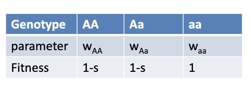 We know that the selection is pruley recessive fitness because teh heterozygous has teh same selection coeficiant (same Relative fitness) as the AA – fitness affect of A = fitness affect of Aa –> means that the fitness affect of A is dominent (Because AA and Aa have the same fitness)