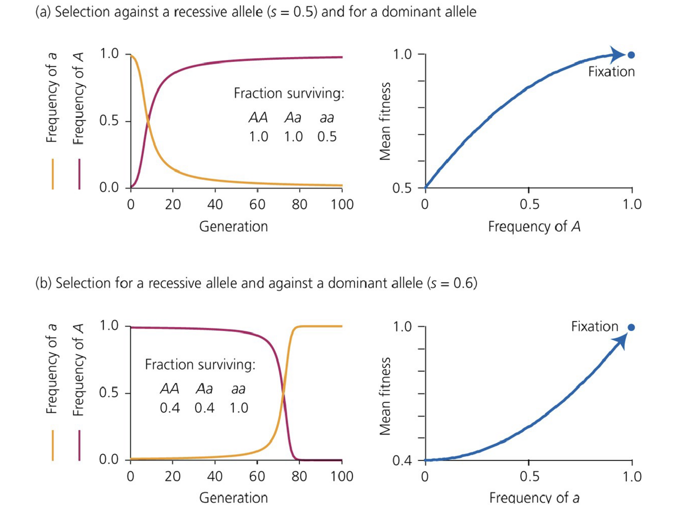 Whether an alelle is domineant or recssive – NS will still push the alelle to increase in frequncey – will get fixation for higher fitness alele in populations over time (for dominant or recessive)