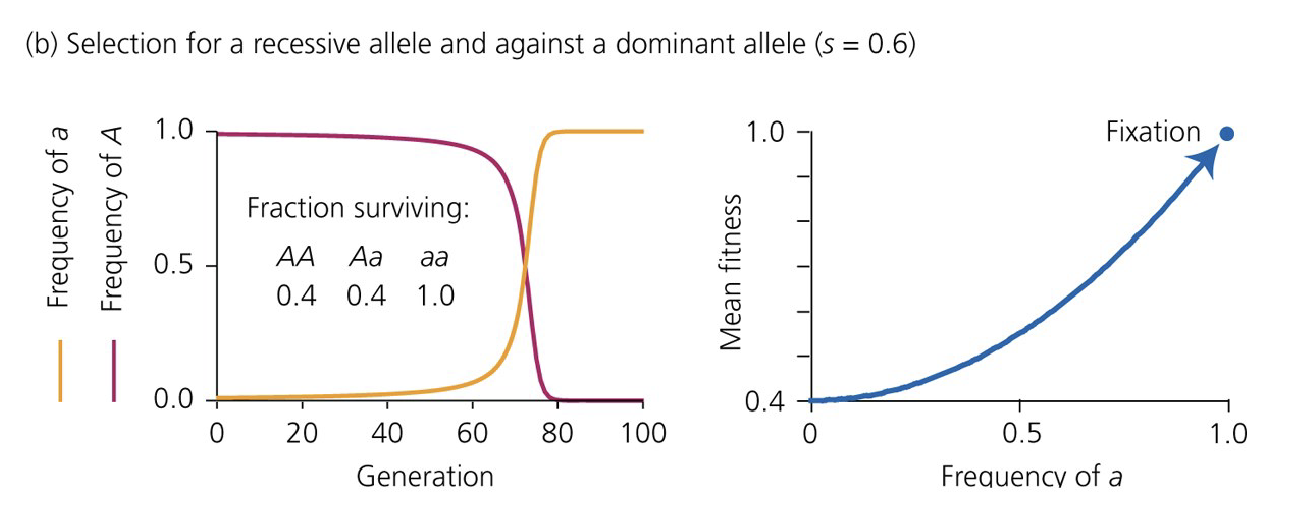 - Selection against the recessive – For benefical dominant alleles at low frequnceies selections acts quickly but slows down as the allele appraches fixation