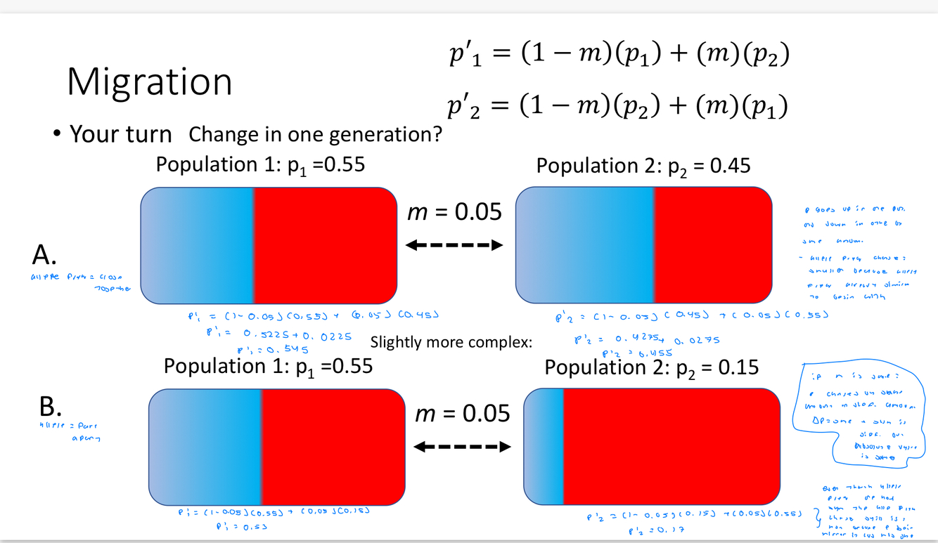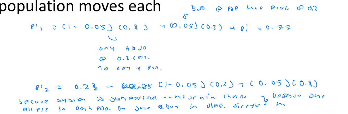 At H-W the allele frequencies would stay the same (no migration) –> BUT THEN we can swap individulas at a rate of m