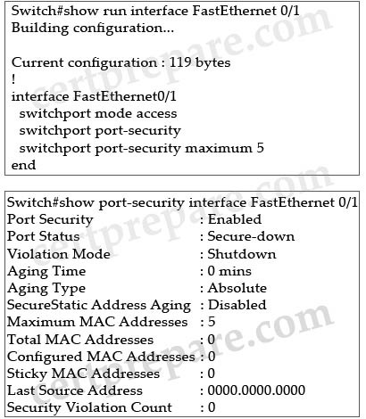 Switch(config)# interface fa0/1 Switch(config-if)# switchport mode access Switch(config-if)# switchport port-security Switch(config-if)# switchport port-security mac-address sticky Switch(config-if)# switchport port-security maximum 1 vlan voice Switch(config-if)# switchport port-security maximum 1 vlan access //Configure static MAC addresses for these VLANs Switch(config-if)#switchport port-security mac-address sticky 0000.0000.0001 Switch(config-if)#switchport port-security mac-address sticky 0000.0000.0002 vlan voice