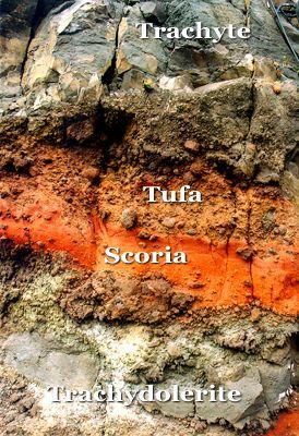 Trachytes are grey or dark-grey rocks found above 300 metres. Trachydolerites are lighter coloured and are found at very high altitudes.