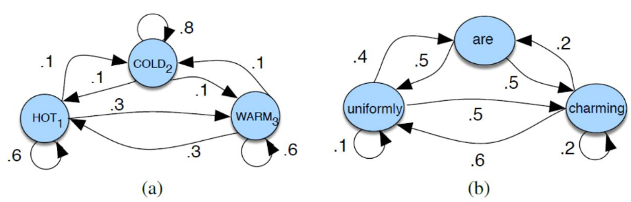 It shows a Markov chain. In Figure b, we can say that the probability of the word are, given the word uniformly, is 0.4.