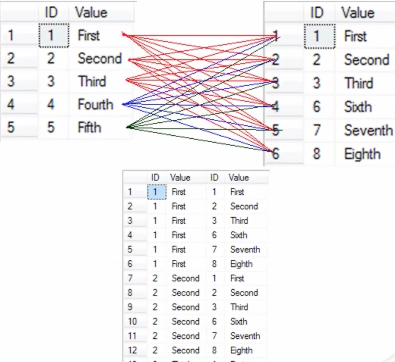 Cross join es la union cartesiana entre dos tablas y no requere cumplir ninguna condicion, es decir que el resultado va a ser la multiplicacion de los records en tabla1 por el numero de records en tabla2, asi si en tabla1 tenemos 3 y en tabla2 tenemos 4, el resultado sera 4x3=12