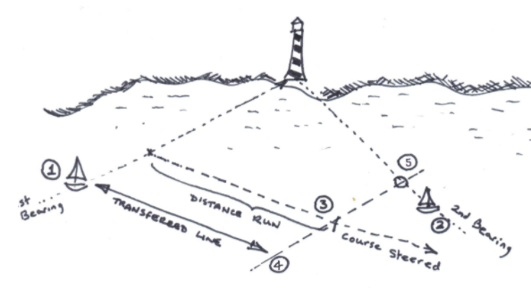 So you have a 1st bearing line, 2nd bearing line, course steered line and the distance you travelled (from bearing line one to bearing line two) marked on your course steered line