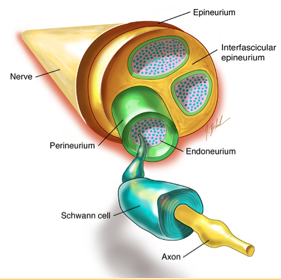 This outermost tissue layer is called the epineurium. Injury to the myelin sheath or axon of a nerve can lead to focal conduction block, degeneration and demyelination.