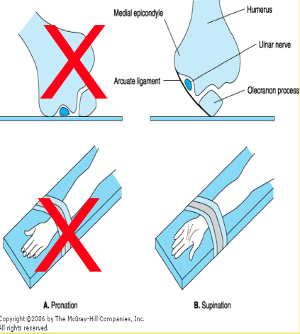 Prevented by positioning arms in supination. Hypotension increases the risk.