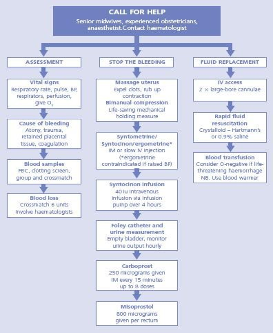 If persistent beyond this point make sure to have called for a consultant and EUA done to determine the cause e.g. vaginal, cervical, perinanal trauma, retained products etc. Repair or surgical measures then used