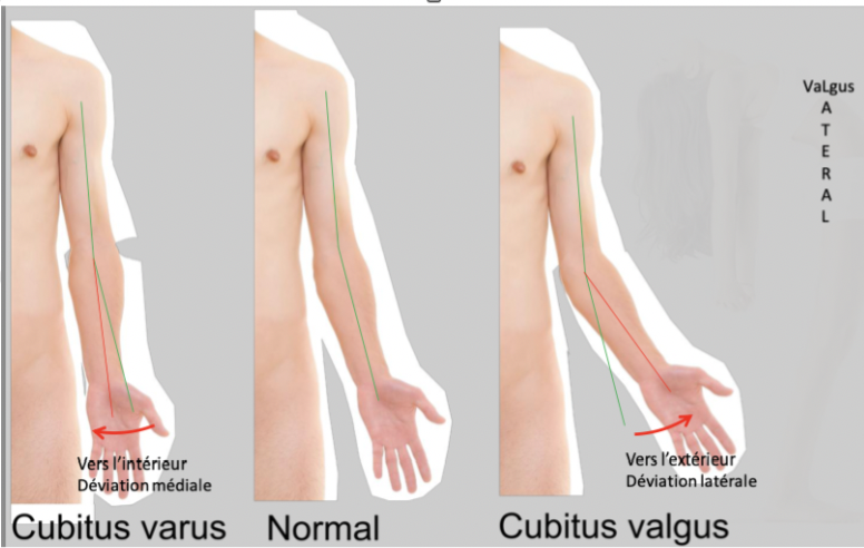 - angulation excessive vers l’int (angulation médiale ou vers la ligne médiane du corps) du segment distal d’un os ou d’une art