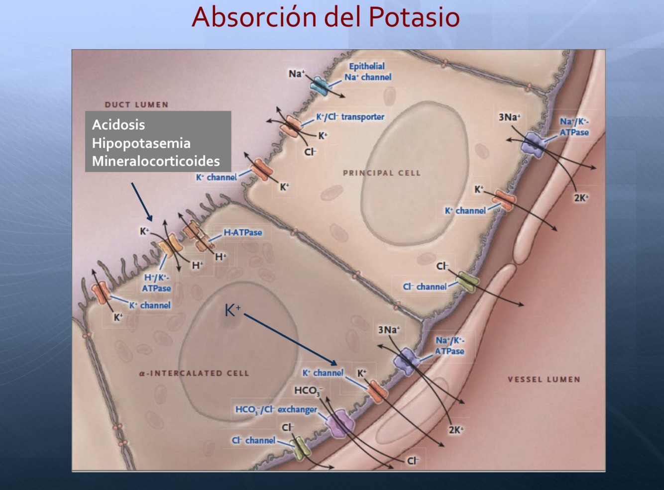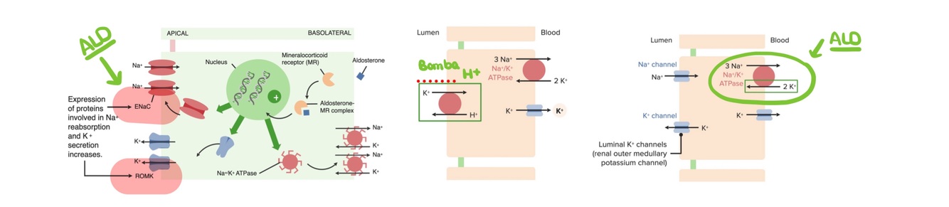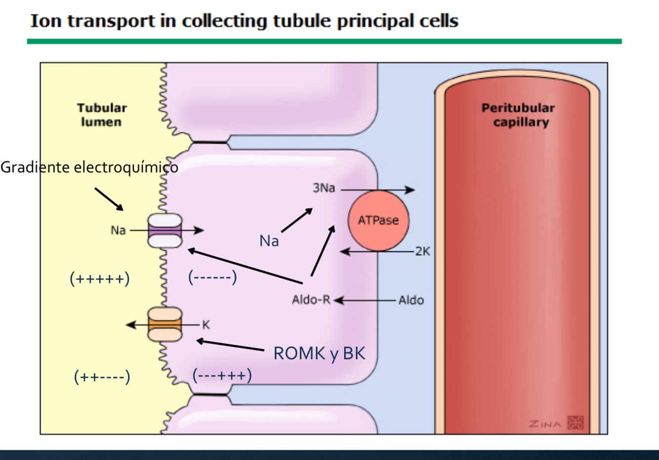 SECRECIÓN - ENac: es fundamental la concentración de sodio en el lumen. Si hay mucho sodio y muchas cargas en el lumen, cuando la aldosterona se acopla a sus receptores, favorece la actividad de canales de sodio eléctricos (ENaC). Los potencia y empezamos a reabsorber sodio. Como también activa la bomba sodio-potasio ATPasa, la célula está cargada de potasio y se establece un gradiente electroquímico. Por un gradiente, sale potasio por los canales ROMK y BK dando hipopotasemia en sangre