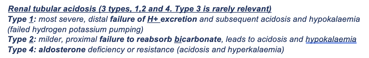 Summarise types of renal tubular acidosis