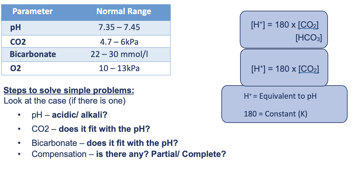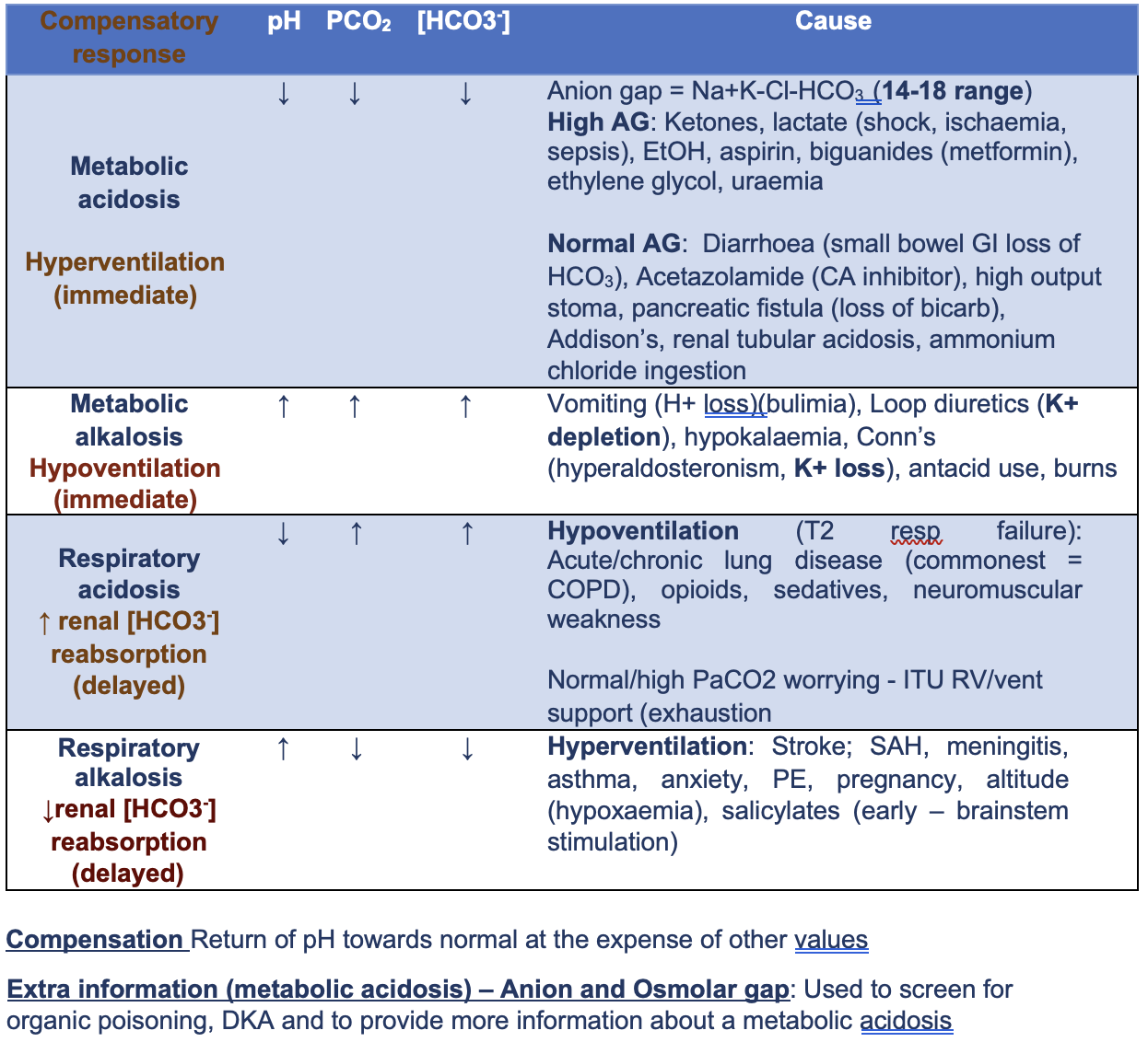 Compare metabolic and respiratory acid-base abnormalities and compensatory mechanisms