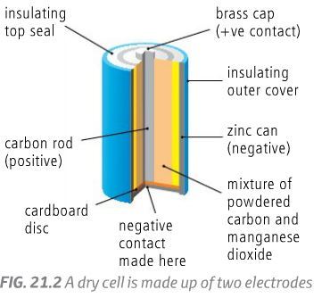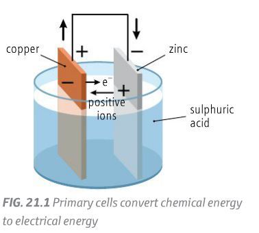 Describe what a primary cell is composed of and give an example of it. (Also known as galvaonic/voltaic cell.)