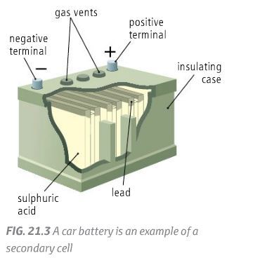 Describe what a secondary cell is composed of and give an example of it. (Also known as an accumulator.)