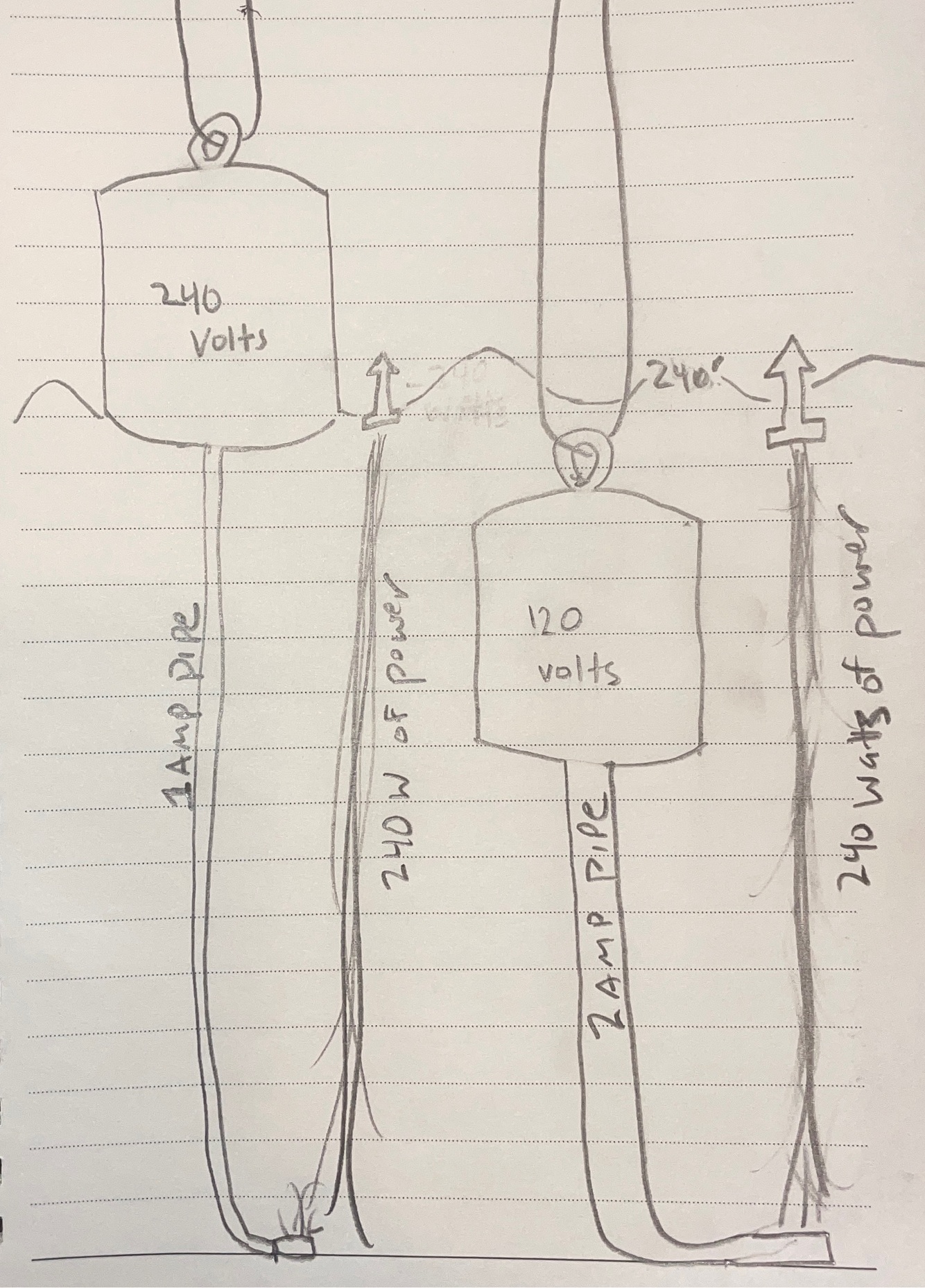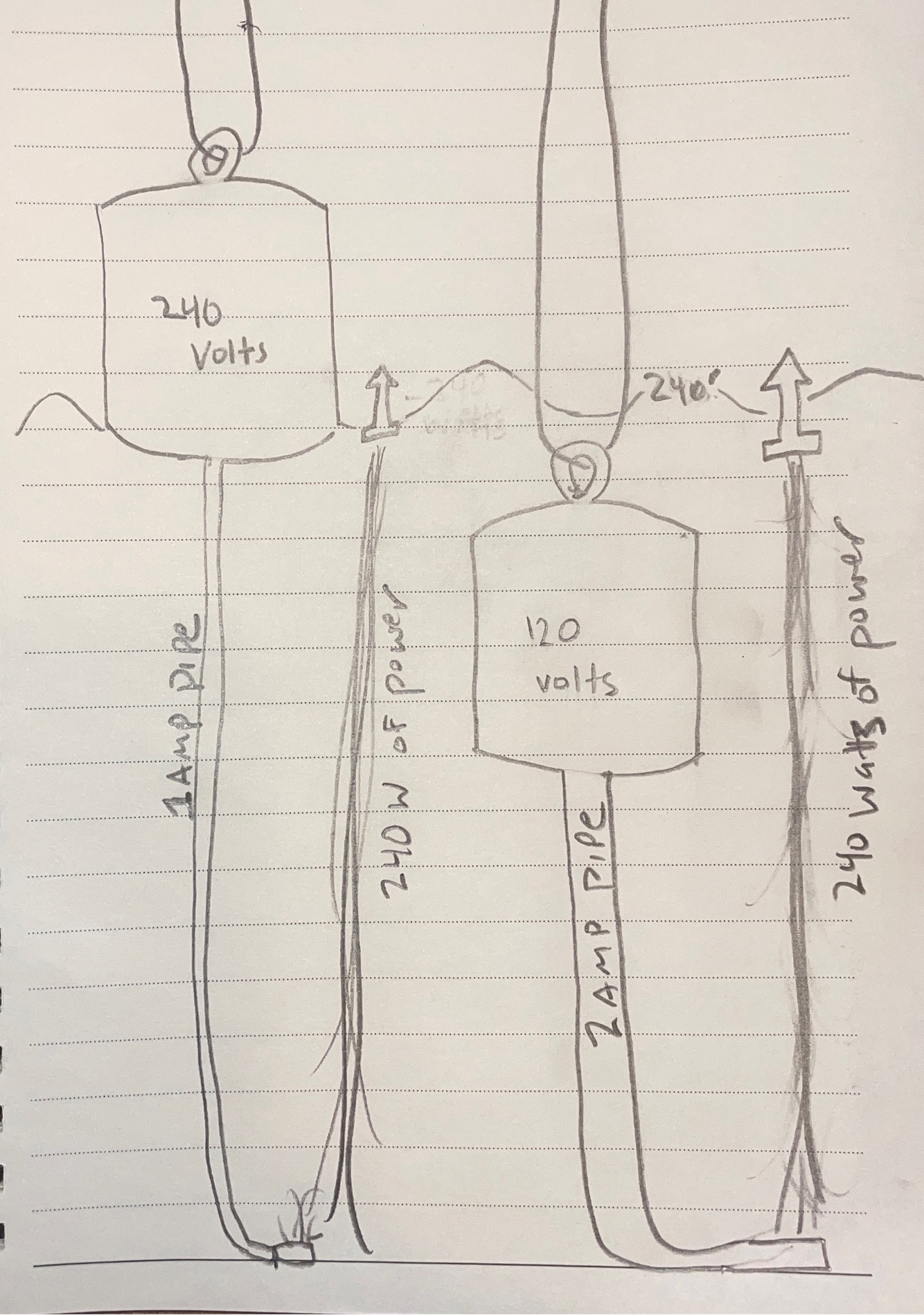 you can see from the attached picture that if you have a water rocket that travels at 1 foot per (watt) and you wanna shoot it 240 (feet) into the air … you could do that with a one (amp) pipe and a 240 foot (volt) water tower or a two (amp) pipe and 120 foot (volt) water tower.