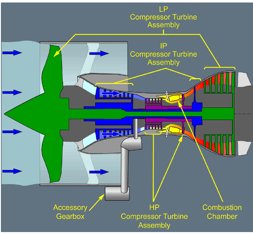 ‐ Three compressor turbine assemblies: ‐ The Low Pressure (LP) compressor turbine assembly, ‐ The Intermediate Pressure (IP) compressor turbine assembly, ‐ The High Pressure (HP) compressor turbine assembly. Each turbine operates its associated compressor via a shaft. ‐ One accessory gearbox, ‐ One combustion chamber.