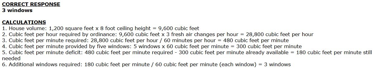 6) Additional windows required: 180 cubic feet per minute / 60 cubic feet per minute (each window) = 3 windows
