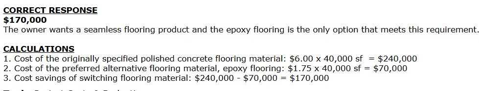 The preliminary bids for a 40,000-square-foot high school addition are over budget. The polished concrete floor originally specified for the floor assembly costs $6 per square foot. The owner requests a seamless flooring product and the contractor suggests the following alternative flooring materials: